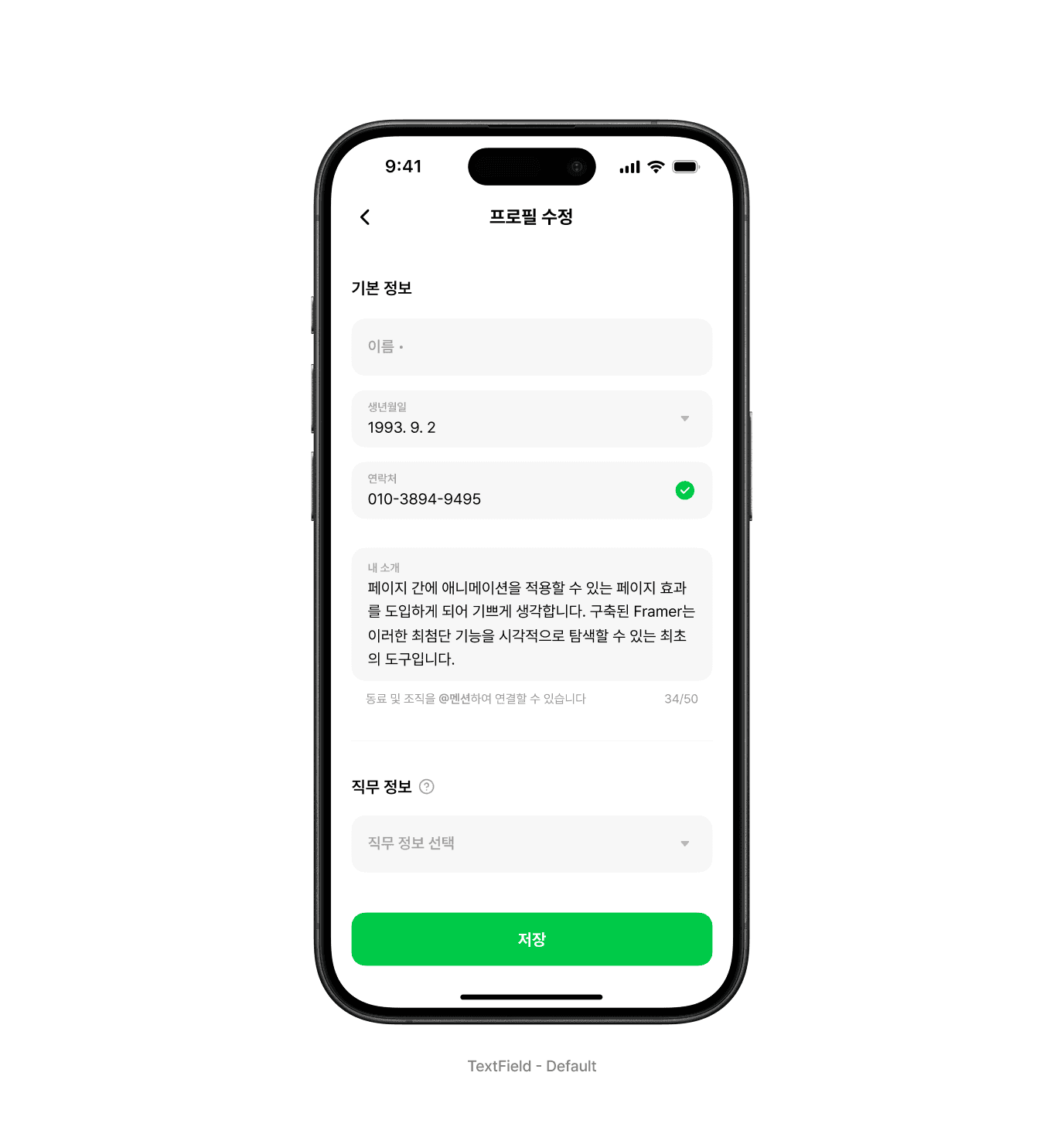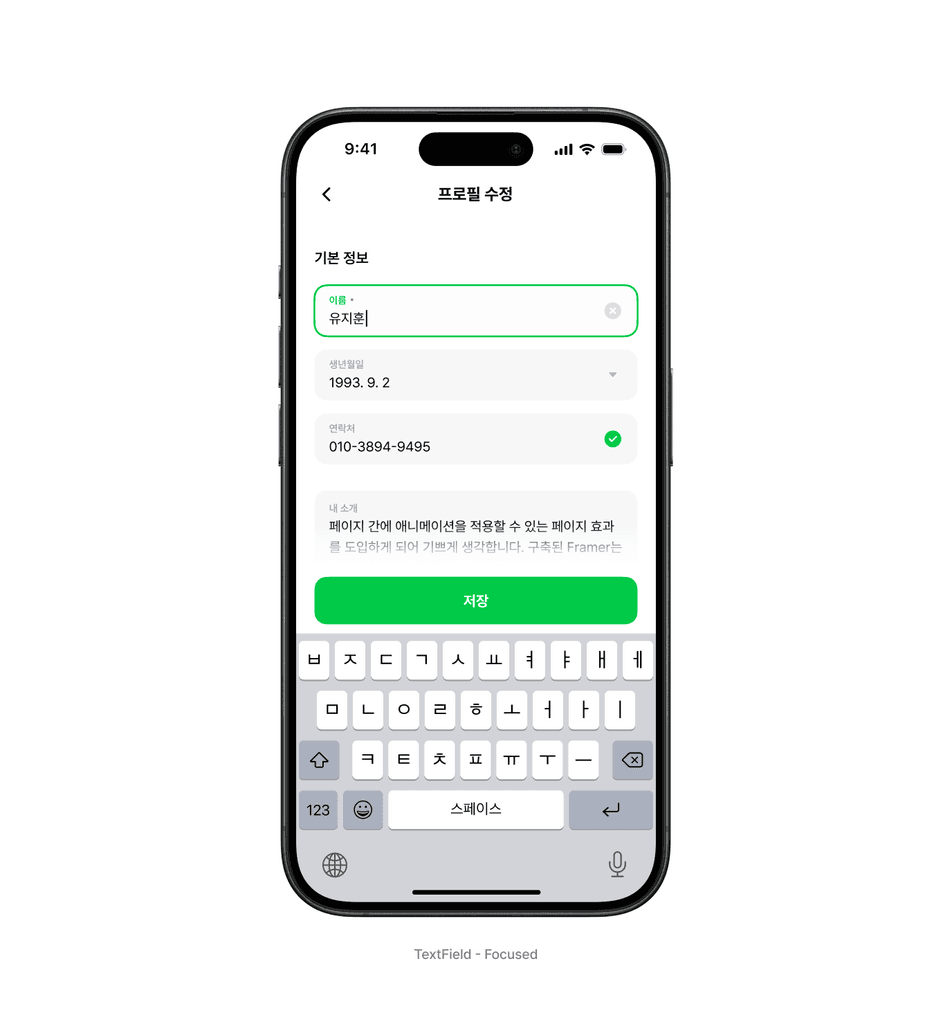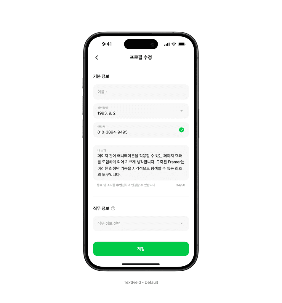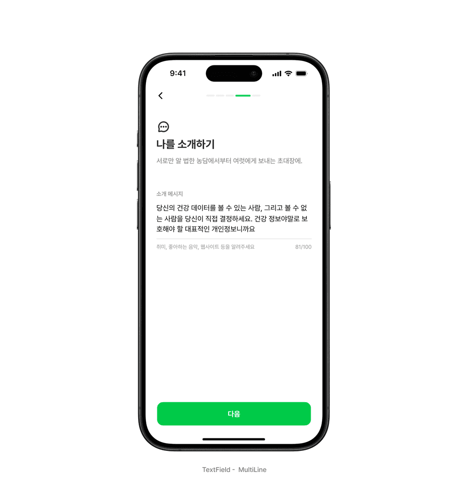 텍스트 인풋 안에서도 제한적인 모바일 화면을 최대한 효율적으로 사용하도록 몇 가지 구체적인 사용 가이드와 기능을 구성했습니다. 포커스, 오류 상태 등에 대한 표현은 기본으로 제공하며 최대 높이, 최대 글자수 제약을 사용하는 경우 표현되는 방법이나 동작과 표현이 어떻게 되는지를 안내합니다.